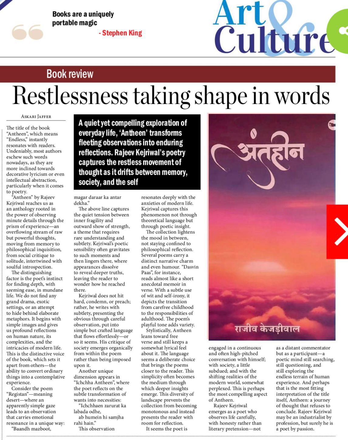 Article of the Hans India on Art Culture Page